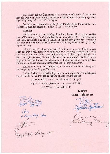 Thưa Bà; Chúng tôi những người con nước Việt, trong những ngày này, lòng đang hướng về Hoàng Sa và Trường Sa thân yêu của Tổ quốc xin gửi đến Bà cùng gia đình lời thăm hỏi ân cần và lời chúc an lành, hạnh phúc!